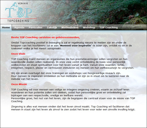 De site is gemaakt in opdracht van Smart Bedrijfsadvies. De site van hun client Top Coaching had een nieuwe look nodig en men zocht naar een mogelijkheid waarbij de gegevens gemakkelijker aan te passen waren, zodat de site altijd up to date zou zijn. Naast de gebruikelijke pagina's beschikt topcoaching.nl ook over een webshop, een agendamodule en een pagina die gebruik maakt van de google maps API . |